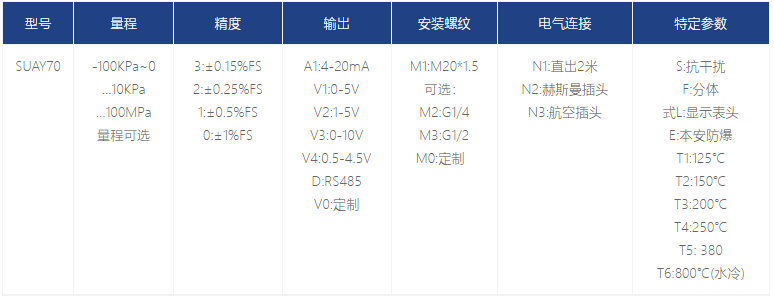 SUAY70 高溫壓力變送器采用耐高溫的硅-藍(lán)寶石技術(shù)的感壓膜片作為核心,匹配特殊的溫度補(bǔ)償和片上線性修正技術(shù),使其在寬泛的溫區(qū)內(nèi)有著良好 的綜合性能。藍(lán)寶石材料對(duì)溫度變化極不敏感,可在-40 至380℃的高溫下,也有著ji佳的彈性力敏特性,不會(huì)產(chǎn)生疲勞、滯后、PN 節(jié)漂移等現(xiàn)象,并且抗輻射性能優(yōu)異。耐磨損,抗疲勞的鈦合金感壓膜片,使該系列產(chǎn)品不僅可以承受高溫,更兼具良好的耐用性、抗沖擊性。利用β相高溫力敏材料與合理的結(jié)構(gòu)設(shè)計(jì),可將溫度擴(kuò)展至 450-850℃。